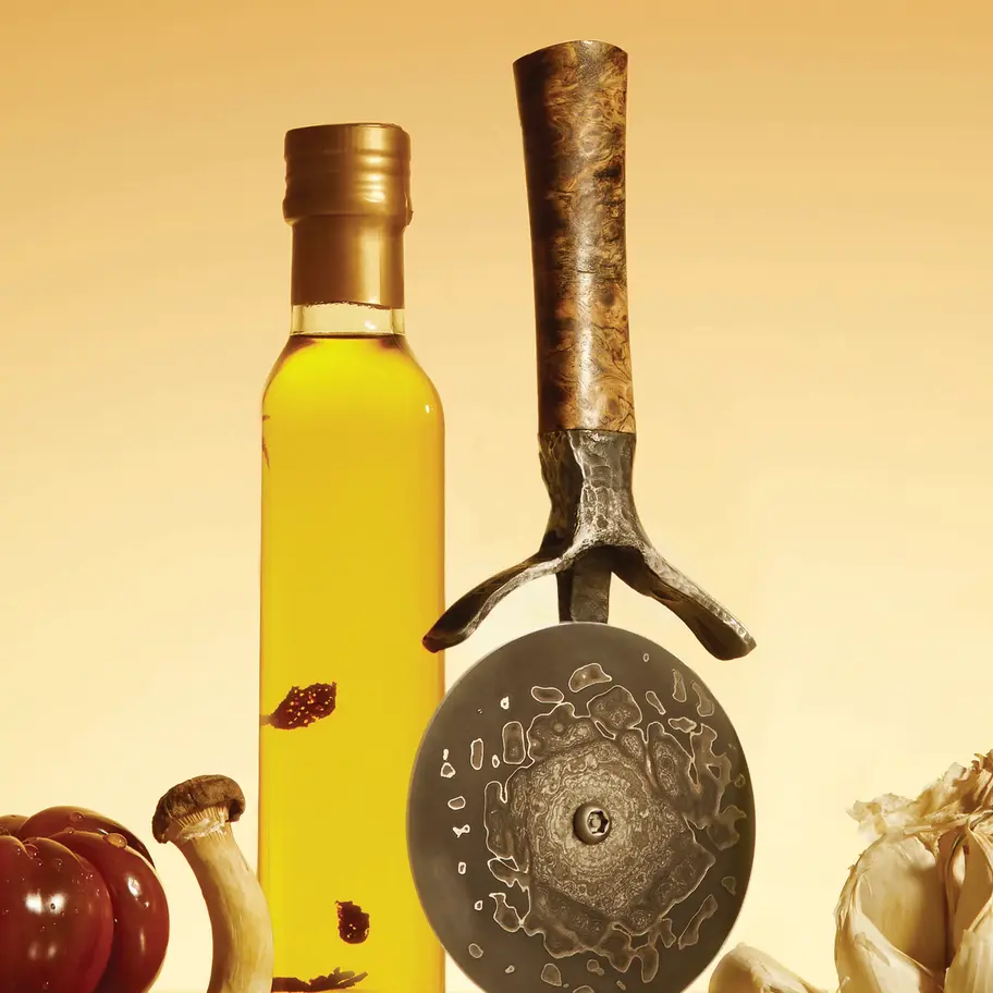 Rankų darbo picos pjaustymo ratukas, pagamintas iš išskirtinio Damasko plieno. Jo ašmenys ne tik itin aštrūs, bet ir pasižymi unikaliu raštu, kuris suteikia įrankiui prabangos pojūtį. Tvirta medinė rankena užtikrina patogų ir stabilų pjovimą net ir storai picai. Tai elegantiškas virtuvės aksesuaras tikriems picos entuziastams.